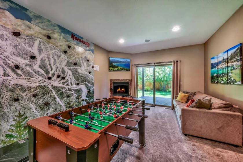 Sitting just 4 miles from the lake, this stylish home offers ample space and entertainment for the whole family. The mountain-style home features natural wood accents and panels throughout the living area, as well as a fully stocked kitchen and dining area with both a bar and a dining table, offering more than enough space to entertain your guests. The living area’s vaulted ceilings and fireplace add to the cozy cabin feel, creating a comfortable woodland experience. This property’s proximity to the Heavenly Ski Resort also makes it great for walking to your next outdoor adventure, whether that's on a trail or the ski slopes! When you’re ready to retreat to the home, the fun continues in the downstairs game room, featuring a rock-climbing wall and an arcade machine! You just might end up staying in this house for the whole trip!